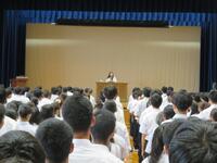 「私は、この夏、感激したことがあります。1つ目は、猛暑の中、部活動でグラウンド・体育館・講堂で汗を流しながら活動している皆さんの姿を見て感激しました。私は、なかなか皆さんと指導で接する機会がないので、ベトナム研修・東京研修などで皆さんと接すると、今自分に与えられていること、今自分がしなければいけないことに精一杯取り組んでいる兵庫高校生のポテンシャルは非常に高いと思いました。皆さんが部活動・生徒会活動・研修で活躍できたのは、それを支えてくれるご家族の方々・先生方がいらっしゃるからです。ぜひ感謝してほしいと思います。2つ目は、卒業生・OBの皆さんです。色々な研修会で『武陽会』の方々にお世話になりました。社会の色々な分野で活躍しておられて、私は本当に様々な人材を輩出してきたすごい学校の校長をさせてもらっているのだと思いました。皆さんも自分がしたい・やりたいと思ったところで、卒業後活躍できるように、2学期頑張ってほしいと思います。