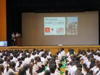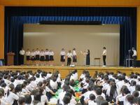 始業式に続いて、全校集会を実施しました。夏休みに行われたベトナム研修の報告会を、代表生徒4名が行いました。家庭科・書道部・ギターアンサンブル部・男子テニス部の表彰伝達を行いました。体育祭実行委員長・生徒会長から諸連絡がありました。最後に、生徒指導部長からのお話があり、令和7年度第2学期始業式および全校集会を終了しました。