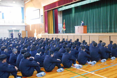 学校長より、3年生は「進路先への準備、残りの学校生活を誇りをもって過ごす」、2年生は「最上級生になる準備、後輩の見本となり学校の中心になる」、1年生は「工業科目はより専門的になり、普通科目も上位科目となっていくので覚悟を決めて学ぶこと」、3学期は短い期間ですが重みのある学期になるので、皆さんの頑張りに期待していますとメッセージがありました。