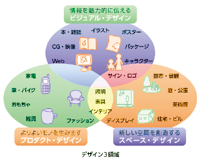 「デザイン」とは、上の図のように「ビジュアルデザイン」、「プロダクトデザイン」、「スペースデザイン」の3つの領域が混ざり合っています。