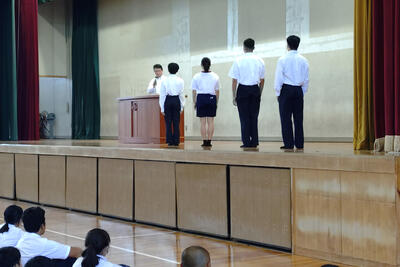 指導部長から「夏休みを向かえるにあたって」「1学期の指導報告」、また、実演を交えながら「ことばのキャッチボール」のお話がありました。最後に、自分を磨き、成長させるような夏にしてもらいたいとメッセージがありました。