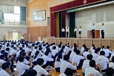学校長より、暑い中ですが先生方の思いを伝えるには全体で集まり、先生方が見守る中で話をすることで、生徒一人一人に伝えることが大事であると話され、「1学期の学業・生活面での振り返り」「工業高校での学びは社会へ出るためのステップ」「県工生である自覚と社会の一員でもあるという自覚」「スマホなどによるSNSの使い方」などのお話がありました。「夏休み」は休むことだけではなく、自分で工夫をして活動し、成長を促していくという意識をもって取り組んでもらいたいとメッセージがありました。