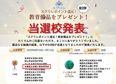 「第二弾スクリレポイント還元!教育備品をプレゼント!」に応募して、本校が「工場扇」をいただきました(応募総数190件、50校当選)。まだまだ暑い日が続きますので、食堂に設置して活用しています。
