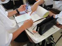 1つの図形をみて、正面図・平面図・右側面図を描きます。立体的にモノをとらえることが得意な生徒はどんどん進めることが出来ますが、苦手な生徒には只々苦痛の時間ではあります。