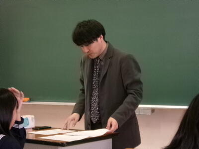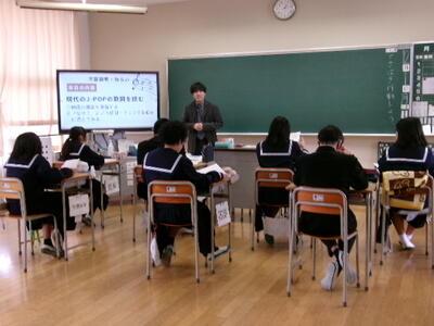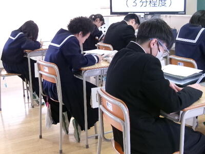 「現代のJ-POPの歌詞を読む」と題して、寺本教諭が生徒に馴染みのある楽曲を取り上げ、歌詞の文学性について考える授業を行いました。中学生には新鮮な題材だったようで活発に意見交換をしながら生き生きと授業を受ける様子が印象的でした。