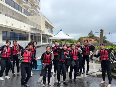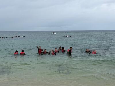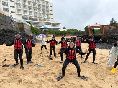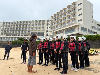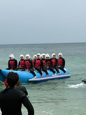 体調不良者もおらず、朝食をしっかり食べてからマリン体験をしました。雨が降ったり止んだりする中、ドラゴンボートやシュノーケリング、ビーチフラッグ等を楽しむことができました。この後は本部町民泊の入村式会場へバスで移動します。