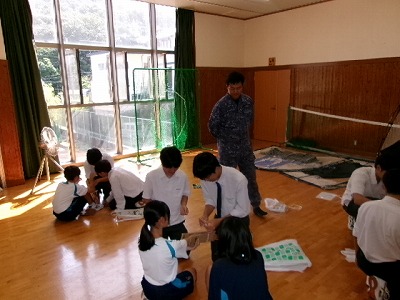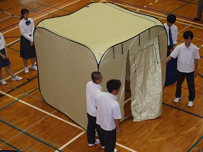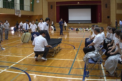 今年は中学校が主体となって計画、準備、運営をしてくださいました。高校生は自衛隊の方による救護搬送と消防署の方による避難所設営の訓練補助、そして幼稚園生、小学生、地域の方の避難誘導の係を担いました。また、訓練後は防災クロスロードゲームで意見を出し合い、「もしも」の時の行動について理解を深めました。