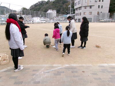 【生徒会】しま遊(モルック) 投稿日時 : 02/10 生徒指導 2/10(火)生徒会の生徒が家島小学校を訪問して児童と遊びを通して交流する「しま遊」がありました。 今回は「モルック」です。モルックはフィンランド発祥のアウトドアスポーツで、木製のピンを倒して得点を競うシンプルなゲームで、1年生が集まってくれました。 高校生と一緒に倒した本数や得点を計算するなど、算数の勉強にもなったようで楽しむことができました。 タグ 生徒会