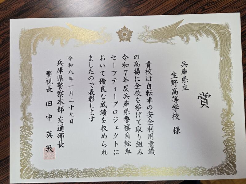 本校では、自転車の交通ルールを守り、安全に通学する意識を高めるための取り組みとして「チャリプロ(自転車プロジェクト)」に参加しています。このたび、日頃から交通ルールを守り、安全な自転車利用に努めていることが評価され、兵庫県警察本部より表彰を受けました。