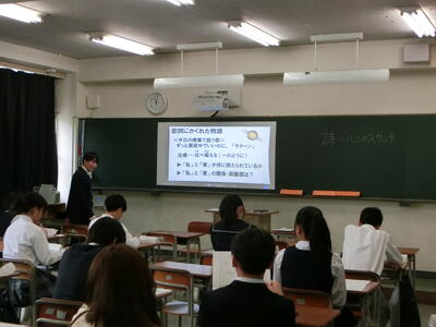 スクリーンには、授業をしている先生の画面と、話を聞きながら授業を受ける生徒の様子が映っています
