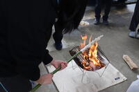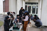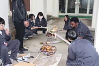 あいにくの雨でしたが、屋根になっている校舎の下で薪を燃やしてパンを焼き、