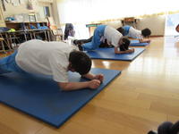 小学部もも・ぶどうクラスでは朝の運動で体幹トレーニングに取り組んでいます。段階を踏みながら回数を重ねていくうちに、コツをつかんで背中をピンと伸ばしたり腕を曲げたりできるようになってきています。