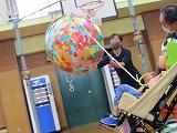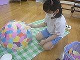 運動会の演技に向けて小道具をみんなで作りました。紙でできた大きなボールにカラフルな画用紙をちぎってペタペタ。大きくて迫力のある動物の卵を作りました。