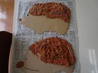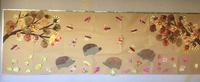 芸術の秋。小学部みんなで大きな秋の壁面飾りを作りました。たくさん手型を押して落葉樹を表現しました。また、コーヒーフィルターを染めて切って紅葉や銀杏の葉、赤トンボを作りました。真ん中には紙粘土に爪楊枝をたくさん刺して作った可愛いハリネズミが集まっています。一つ一つ子どもたちの個性が出ていて、とても魅力のある壁面が完成しました。