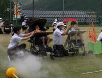 グラウンドでの運動会は1年生以来!緊張しながらもお母さんに嬉しそうに「がんばる」と手話で伝えている姿がたくましかったです。小学部演技では、敵の忍者めがけてボールを蹴って倒しました。本番では見事一撃命中!パラバルーンの「かくれみの術」で中に入った時は、最高の笑顔でした。教室に戻ってから飲んだコーラとお弁当は最高でした。