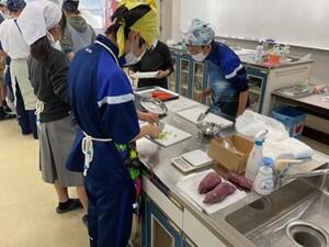 私たちは、スイートポテトを作りました。猪名川高校の生徒と調理実習をすることは初めてでしたが、協力をしながら作ることができて良かったです。スプーンやマッシャーで潰すことが難しかったです。さつまいもの皮を手でさく時、多少熱かったです。猪名川高校の方がさつまいもを切る際、手際良く輪切りにしているところが凄いと思いました。