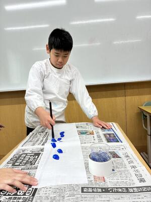 図工の時間に学習したスパッタリング技法を使って年賀状作りをしました。うまの台紙の上からブラシに絵の具を付けて網を一生懸命こすり、うまの形を浮き上がらせることができました。