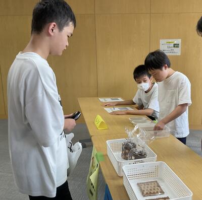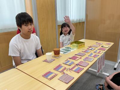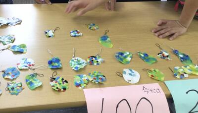 作業学習の時間に作った製品で中学部全体で初めての販売学習をしました。手芸班はあみあみコースター、栽培美化班はペットボトルのふたから作ったカラフルキーホルダー、木工班はオリジナルマグネット、紙工班はペン立て、封筒、コースターと、各班で作ったものがたくさん並びました。「いらっしゃいませ~」と呼び込んで商品を渡したりお金を受けとったりする店員さん、何を買おうかなとわくわくしながら各班のお店をまわるお客さんと、みんなで順番に行いました。お互いの作っているものを見たり、自分たちが作った製品を買ってもらったりする中で、自信を持ったりお互いに認め合ったりできる機会につなげていきたいです。