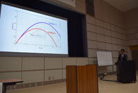 講演は、大阪公立大学大学院工学研究科 物質化学生命系専攻応用化学分野 有機機能化学研究グループ 前田壮志准教授から、「有機色素の開発最前線」をテーマに話して頂きました。内容は、合成染料の歴史と反応機構、機能性色素の研究の最前線、有機薄膜太陽電池の作り方と構造や、有機薄膜太陽電子の起電メカニズムが2種類の有機化合物の薄膜で発電できるのかなど、科学の歴史から最先端の研究まで、興味深く教えて頂きました。