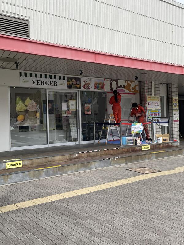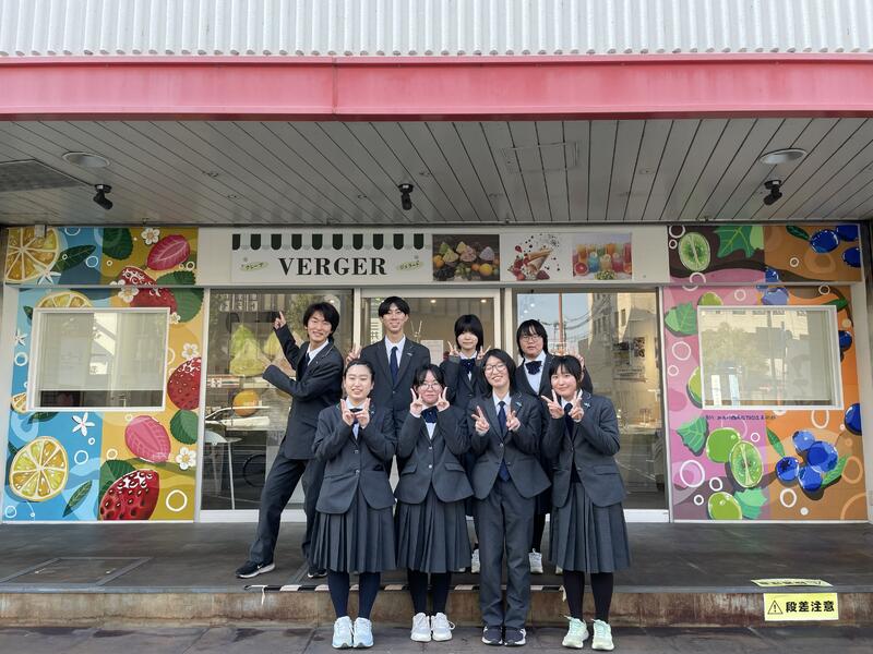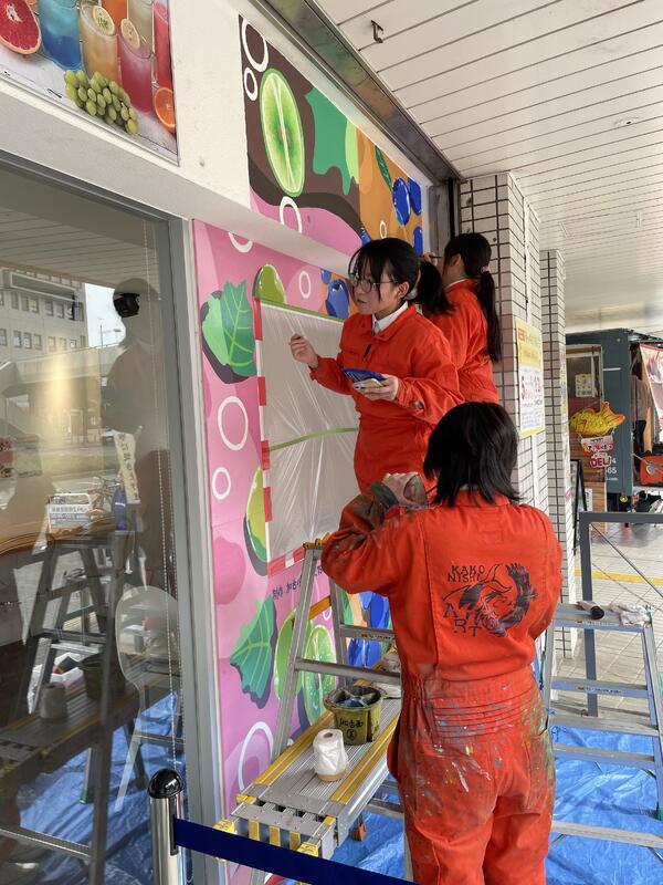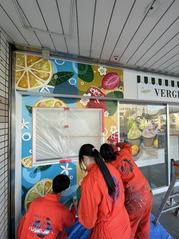 加古川ヤマトヤシキ1FのVERGER(クレープ・ジェラートのお店)の外壁に、みずみずしいフルーツをモチーフにしたカラフルなデザインを、79回生の美術部が担当し、制作しました。第15回美術部展開催中に、同時にライブペインティングという形で制作しました。美術室で籠って作業するいつもと違い、多くの方に観ていただきながらの制作となりました。新聞を見て声をかけて頂いた方もいらしゃいました。「頑張ってるね~」と声をかけてもらったことが生徒の力になりました。本当にありがとうございました。加古川の街に自分たちの作品があり、多くの人の目に触れることとなり、美術部員は少し誇りに思ったと同時に嬉しく思っています。最後になりましたが、このような機会を頂いたVERGERの皆様に御礼と感謝を申し上げます。ありがとうございました。