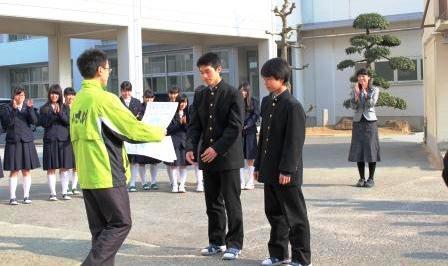 5.21 全校集会で表彰伝達 男子バドミントン部