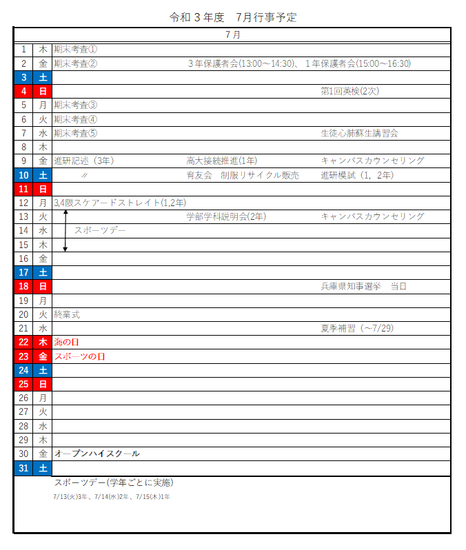 令和3年 7月行事予定