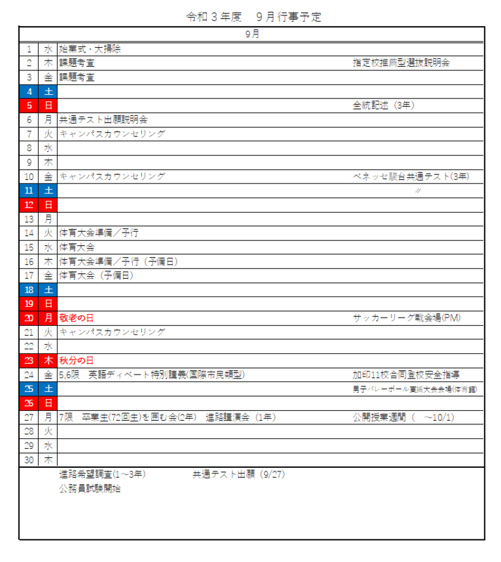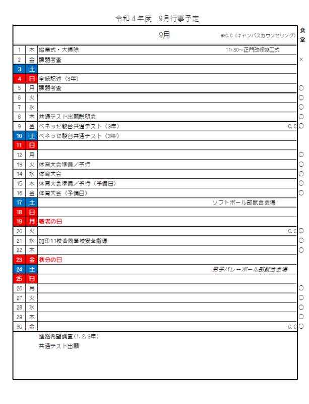 9月行事予定