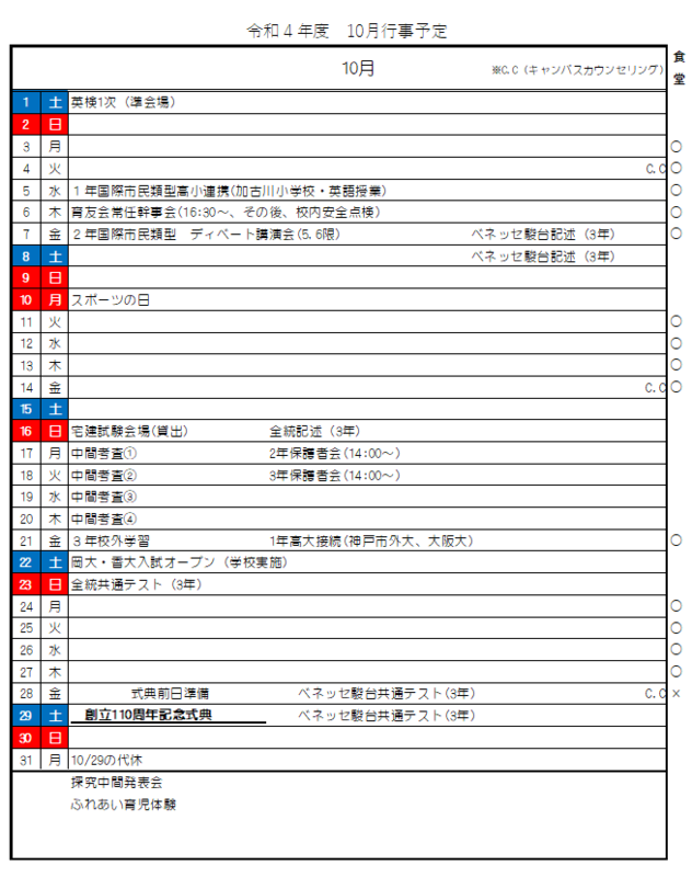 令和4年度 10月行事予定