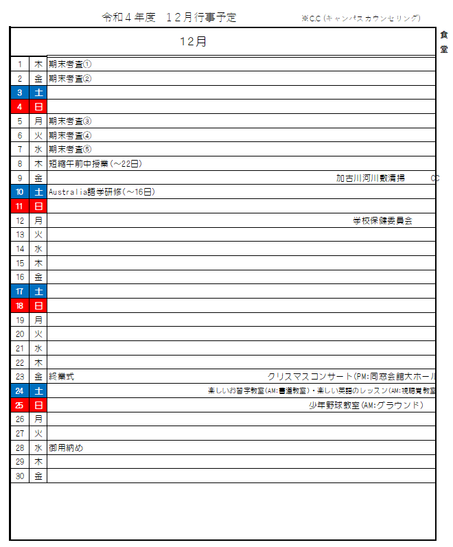 令和4年度 12月行事予定