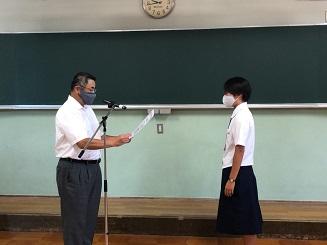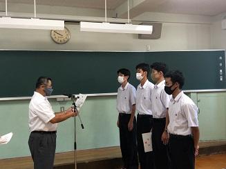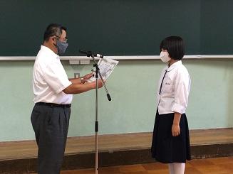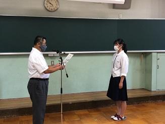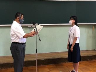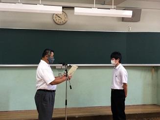 本日、終業式、表彰伝達式、生徒会認証式、全国大会壮行会がリモート配信形式で行われました。