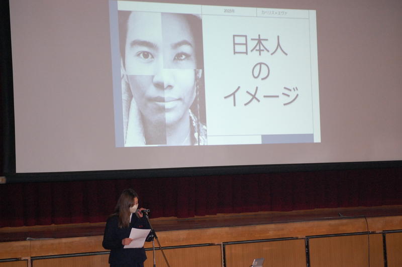 留学生カベリス・エヴァさんによる発表。「西洋人から見た日本人のイメージ」というタイトルで、日本語で発表を行いました。ジョークを交えたユニークな発表でした。
