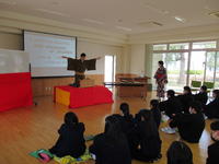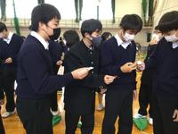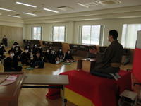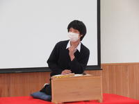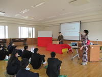 講師は須磨乃家茶里さんと西ノ家喜亭さん。生徒たちはこの1年間、日本文化について、英語で発信する活動に取り組んできました。その中で英語に翻訳された落語を読んだことはあったものの、実際に聞くのは初めて。最初は緊張して席につきましたが、講師の先生方の巧みな話術と英語で「落語の7つの特徴」を教えていただいているうちに、リラックスした雰囲気に。聞き手の『想像力』が大切と理解してから、英語落語を楽しみました。続いて、グループに分かれて英語落語に挑戦。最後には各グループの代表が発表しました。