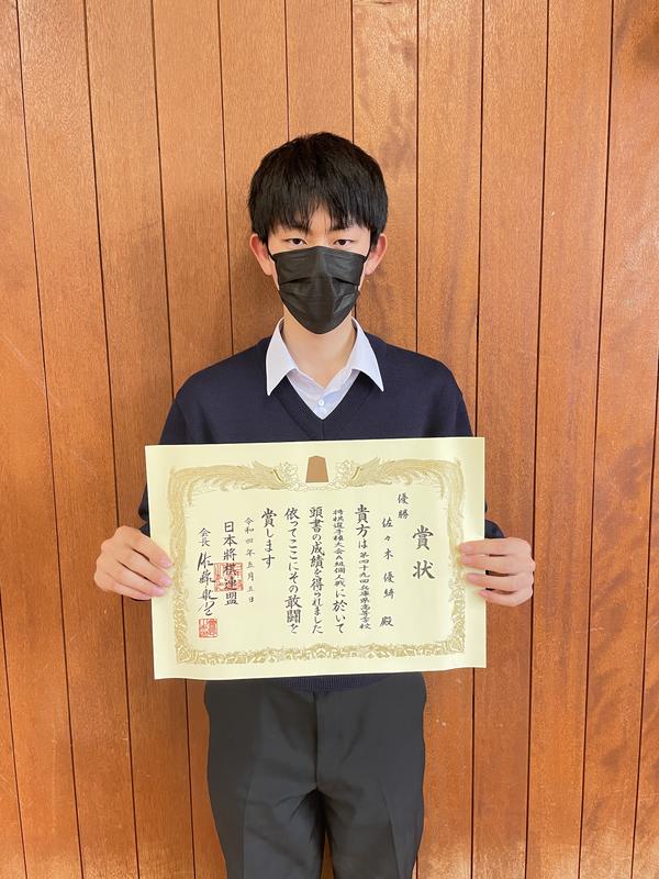 5月5日(木・祝)、尼崎稲園高校にて、第49回兵庫県高校将棋選手権大会が開催され、本校2年生の佐々木優綺くんが出場しました。見事優勝を果たし、8月に行われる全国総合文化祭東京大会への出場権を獲得しました。佐々木くんは、昨年も同大会で優勝し、全国総合文化祭和歌山大会に出場しました。