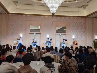 早起きをして朝食会場に集合していた生徒達に、ディズニーのキャラクターが会いに来てくれました。