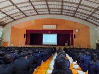 相生警察署交通課から講師をお招きして、「自転車安全運転講習会」を全生徒を対象に行っていただきました。この4月より自転車にも「交通反則通告制度」が適用されたことについて、わかりやすく説明していただきました。兵庫県内での交通事故は減少傾向ですが、自転車が関わる死亡事故は増加しているそうです。自転車に導入される青切符は、16歳以上の運転者が対象となります。「免許はなくてもドライバー」「ルールを守って責任ある運転」「自転車に乗る時は、ヘルメット着用!」と改めて自覚しました。