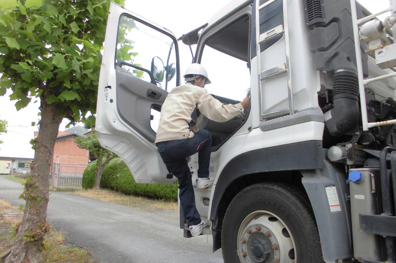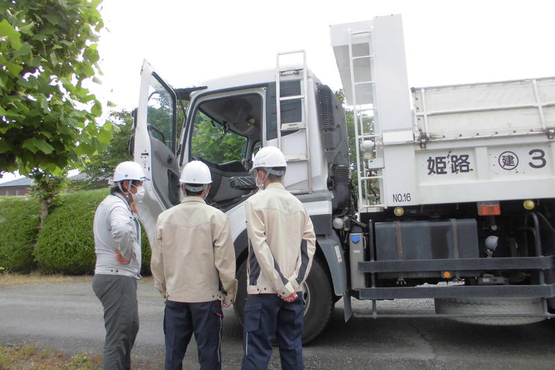 説明会の後半は、大型トラック乗車、番線を使用した資材の固定、空調服とフルハーネス着用について体験しました。