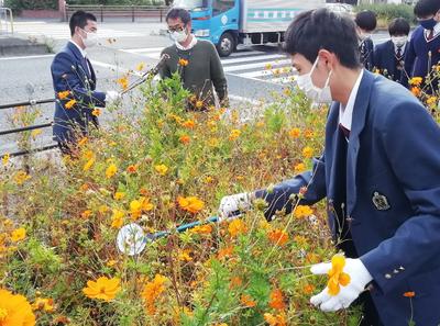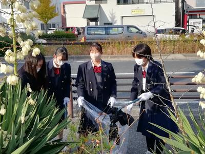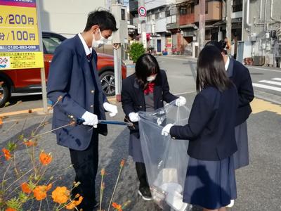 地域貢献事業の一環として2年生が校外清掃を行いました。今回は住宅地の中の道は地域の方がきれいにしていただいているので、吉備彦神社やごみが非常に多い国道や大きな道沿いを中心に実施しました。