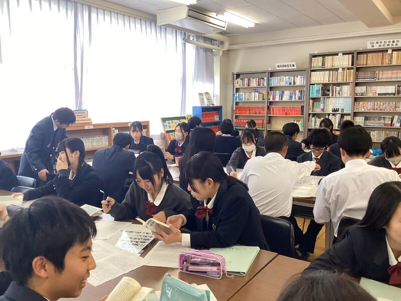 前半はオリエンテーション、後半は春休み課題の読書『中高生のための「探究学習」入門』をもとに、班に分かれて探究活動の安全と倫理を周知するためのポスターを作成しました。