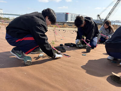 尼崎の森中央緑地は、兵庫県の植物や木々を種から育て、多様な生物が暮らす森を100年かけて作っています。教育と絆コースはエリア設定型団体として参加し、指定エリアを県尼の森として植樹や間伐、除草等の作業を行い、森作りに協力しています。