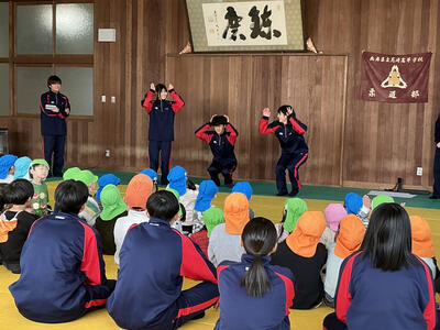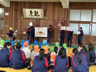 当日は、生徒たちが西長洲保育園の園児に楽しんでもらえるように紙芝居やダンス、クイズなどを企画し、一緒に体を動かしたり答えを考えたりしながら楽しい時間を過ごしました。