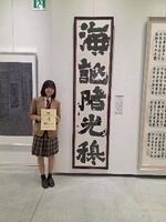 今回、私は「碧羅の天」という作品を書きました。苦しいことや困難なことがあってもそれを乗り越えたら必ず夢を叶えることができるという思いを詩文に込め、タイトルを晴れ渡った青空という意味をもつ言葉にしました。作品を書いていく上で中々思うように書けず行き詰まることもありましたが最後まで諦めずに書き続けた結果、自分の納得のいく作品を書き上げることが出来ました。そして賞を頂くことができ、今までの努力が実って本当に嬉しかったです。次は近畿大会に向けて更なる高みを目指して挑戦していきます!