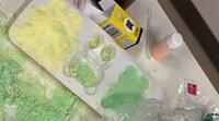 1つ目は、水と洗濯糊のみの一般的なスライムを作りました、ホウ砂水の濃度が濃いので少し硬めのスライムになったため糊を追加して伸びやすくしました。今日は用意していませんがグリセリンの原液やその成分が入った美容液を追加する、温めるなどで柔らかくする方法もあります。(加えると柔らかくするものを可塑剤と呼びます)最終的には少量を取ってボンドを混ぜて、雪崩れスライムにしました。