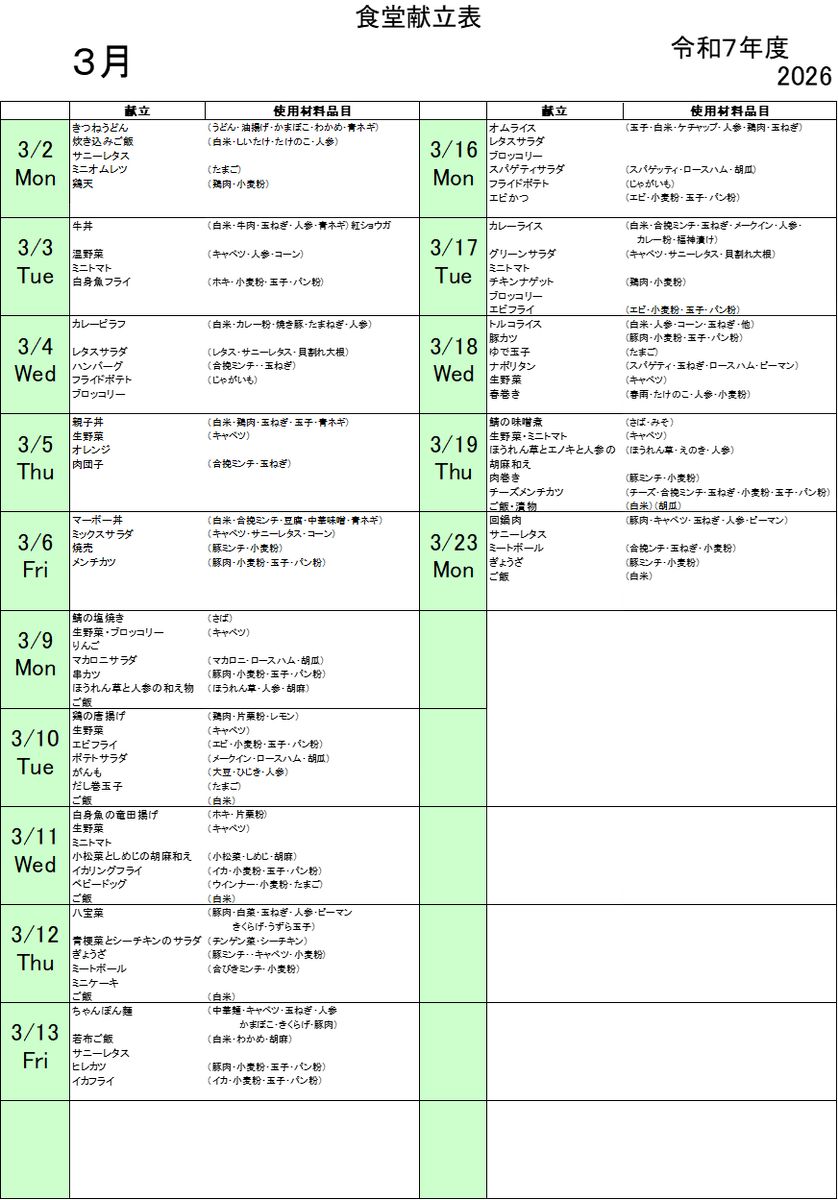 メニュー・使用材料を食堂利用の参考にしてください。急遽メニュー・使用材料を変更する場合は、分かり次第SHRやGoogle Classroomでお知らせします。