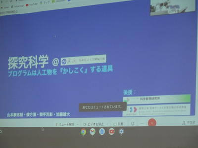 9月2日午後、本校3年生が、NPO「科学教育研究所」と「関西広域 医療データ人材教育拠点形成事業」後援のもと、独自教科「探究科学」でプログラミング学習を行いました。WEB配信で教えてくださったのは、科学教育研究所理事長の山本雅敏先生、京都大学の山本豪志朗先生、京都産業大学の棟方渚先生・御手洗彰先生・加藤雄大先生です。