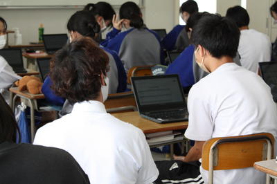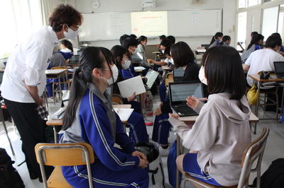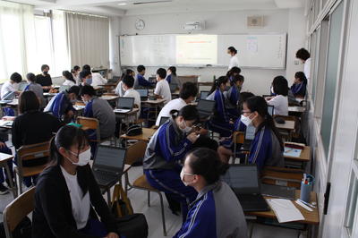 5月31日(火)に2年生グローバル アーツコースにおいて総合的な探究の時間で「BizWorld Proプログラム」(起業家人材育成プログラム)Session3を実施しました。今回もBizWorld Japanの尾﨑先生と認定フェローの芹澤先生にご来校いただき、指導していただきました。3回目となる今回の講義では、最初に1人1台のノートパソコンを活用した早押しクイズ形式で前回の講義の復習をし、その後、会社設立に必要な役職(役割)の説明をしていただきました。後半では、各自がノートパソコンを使用して、採用求人票の作成等を体験し、最後に2人1組となって模擬採用面接を行いました。いよいよグループごとの会社設立に向けて動き出しました。今後、生徒たちには、プログラムの体験を通してチームワークとリーダーシップのスキルを身につけてくれることを期待しています。