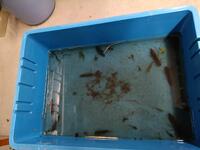 ヤゴ(クロスジギンヤンマ?・ルリボシヤンマ?・シオカラトンボ?)とミナミヌマエビとヒキガエルのオタマジャクシです。トンボたちはあと数日で羽化するようで、ケージにバケツごと格納されました。