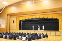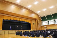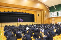 新入生は、事前に配付された部活動紹介冊子を見ながら、うなずきつつ真剣に耳を傾けていました。また、隣同士で感想を言い合う場面もあり、終始和やかな雰囲気の中で紹介が進みました。