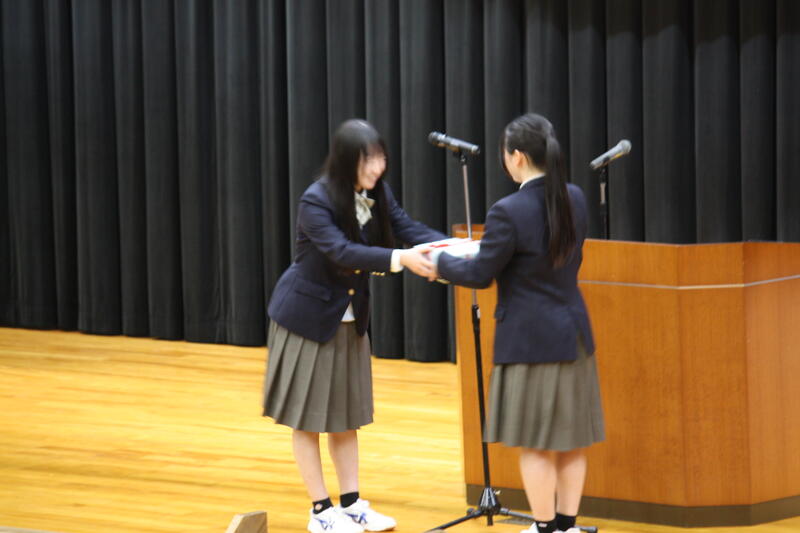 卒業生より学校へ卒業記念品目録贈呈の後、同窓会・PTAより卒業生へ卒業記念品の贈呈、生徒会より卒業生へ卒業記念品の贈呈がありました。
