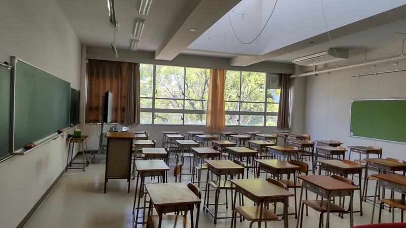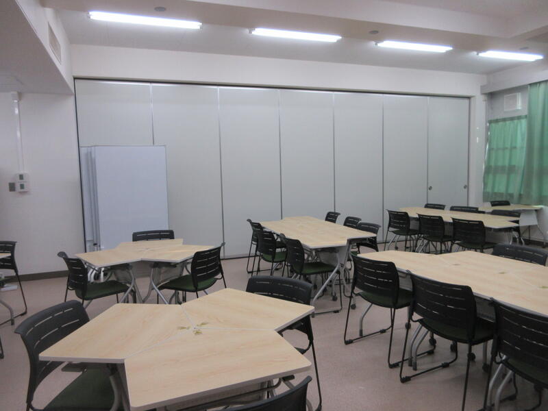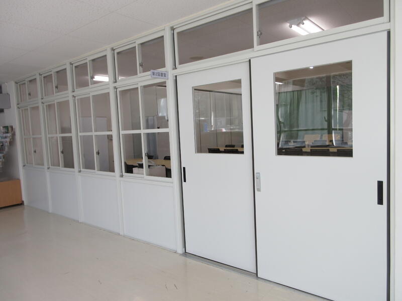 ・廊下側の壁をガラス張りにし、ロールカーテンを設置しました。グループ協議では、スクリーンとしても使います。室内の壁を折りたたみが可能なパーテーションに変え、規模の大きな集団で活動する際に開放し、隣室とつなげて協議や講義等を行います。