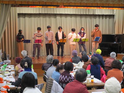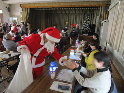 1人暮らしの高齢者の見守り活動を続けるボランティア団体「和(なごみ)の会」主催のクリスマス会にボランティア同好会のメンバー7名がその進行のお手伝いをしました。ハンドベル演奏で会場に優しい響きを届け、サンタクロースに変装し心を込めたプレゼントを届けました!